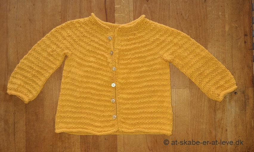 Trøjen er strikket efter en opskrift i bogen DET FINESTE Babystrik 0 – 18 mdr. af Susie Haumann. Originalmodellen er strikket i ren uld. Jeg valgte en blanding 50% uld og 50% bomuld (all seasons fra Hjertegarn). Mit garnvalg får tværstriberne til at træde tydeligere frem. De består af to pinde perlestrik. Derefter fire pinde glatstrik. Rullekanten er nogle pinde glatstrik efterfulgt af nogle pinde omvendt glatstrik.