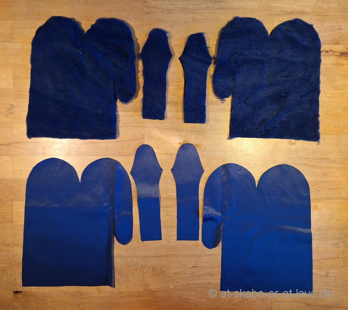 Foeret i vanterne skulle være teddybear. Da det fylder godt, valgte jeg at tegne mønsteret i to størrelser, så ydervanten er en størrelse større end indervanten. Derefter klippet i stoffet.