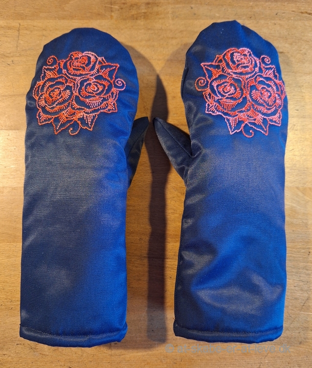 Lidt kulør måtte der godt komme på, så vanterne har fået nogle broderede roser udført på broderimaskinen. Der er valgt en tråd, der skifter lidt i farvenuancer.