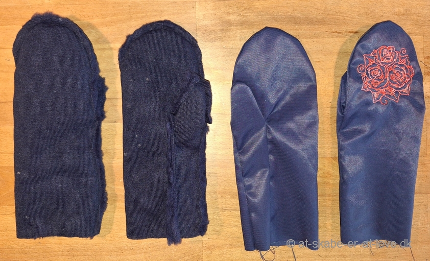 Foeret er ret tykt, så selvom det er en størrelse mindre end ydervanten, blev sømmerummet alligevel klippet ned. Dernæst er det bare at få foret placeret i yndervanten. Ydervanten blev klippet lidt længere end foeret, så der til sidst er lavet et ombuk, som, er stukket fast.