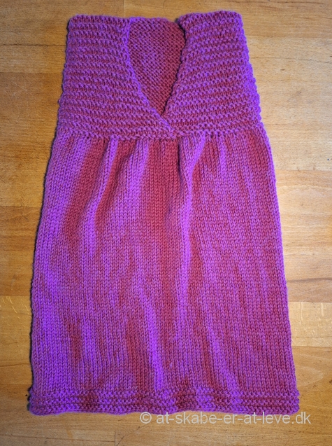 Jeg havde fået nogle nøgler uldgarn forærende. Med tre nøgler, hvor der var taget lidt af en af dem, skulle der findes et mindre projekt. Det blev til denne ærmeløse kjole til den lille på 15 mdr.