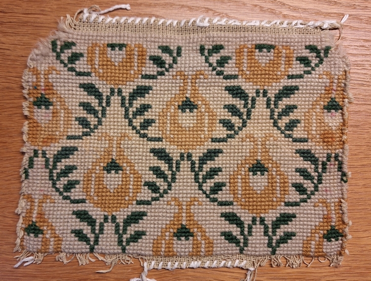 Betrækket, som oldemor i sin tid havde broderet, korssting med uldgarn på stramaj, blev gemt. Trods mange års brug, har farverne holdt nogenlunde. Stykkerne blev vasket og noget af det kan bruges til andet.