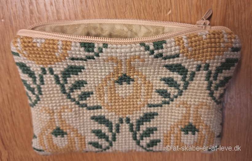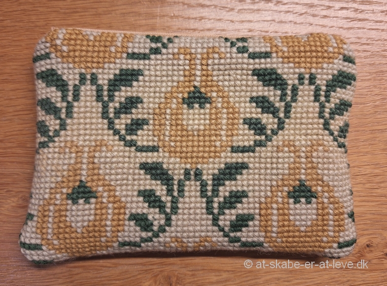Som bagside af pungen er brugt et stykke uldstof i samme farve som bundfarven i broderiet, så det harmonerer med det uldbroderede forstykke.